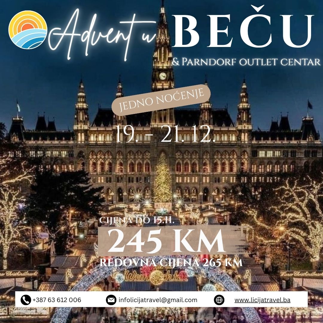 ADVENTSKO PUTOVANJE 1 noćenje u Beču PROGRAM PUTOVANJA Polazak: 19.12.2025. Povratak: 21.12.2025. PROGRAM PUTOVANJA 1.dan (Petak, 19.12.2025.) BiH-HR Polazak iz Banovića u 22:00h, iz Tuzle ispred hotela Tuzla u 23:00h. Noćna vožnja pored Osijeka, Gyora i Budimpešte sa pauzama po potrebi grupe. 2.dan (Subota, 20.12.2025.) PARNDORF-BEČ (ŠENBRUN+NOĆNA PANORAMA) Nastavak putovanja prema Beču. Dolazak u Parndorf…