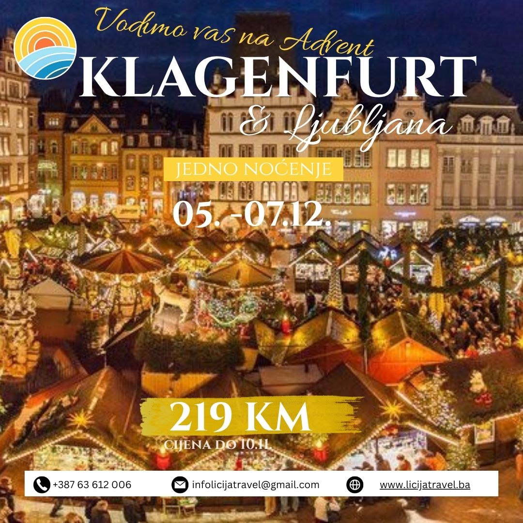KLAGENFURT + LJUBLJANA Polazak: 05.12.2025. Povratak: 07.12.2025. 2 dana / 1 noćenje sa uključenim doručkom PROGRAM PUTOVANJA: Polazak iz Banovića u 00:30, iz Živinica u 00:45 h, iz Tuzle u 02:00 h, iz Lukavca u 02:15, Srebrenik 02:40 h, Orašje 03:10 h. Noćnja vožnja uz usputne pauze grupe. Dolazak u Klagenfurt oko 11:00 sati. Po…