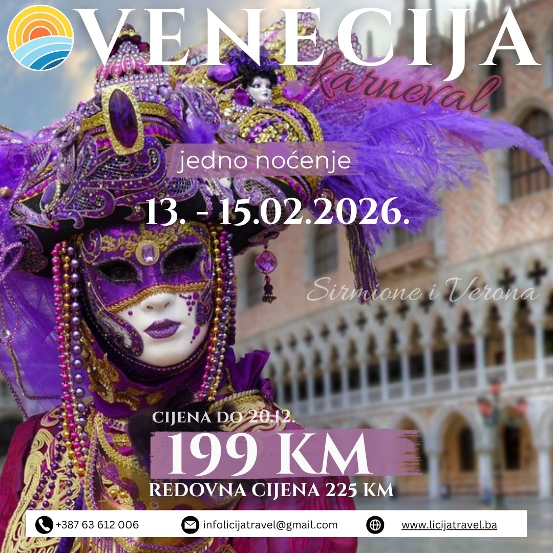 KARNEVAL I DAN ZALJUBLJENIH U VENECIJI 1 noćenje sa doručkom u Hotelu 3* Polazak: 13.02.2026. Povratak: 15.02.2026. PROGRAM PUTOVANJA: 1.dan (Petak, 13.02.2026.) BIH-HR-SLO Polazak iz Konjica u 19:00 sati a iz Sarajeva u 20:00h te vožnja preko Kladnja do Banovića (polazak 22:20h) a zatim Tuzle. Polazak ispred BCC Tuzla u 23:00 sati. Noćna vožnja preko…