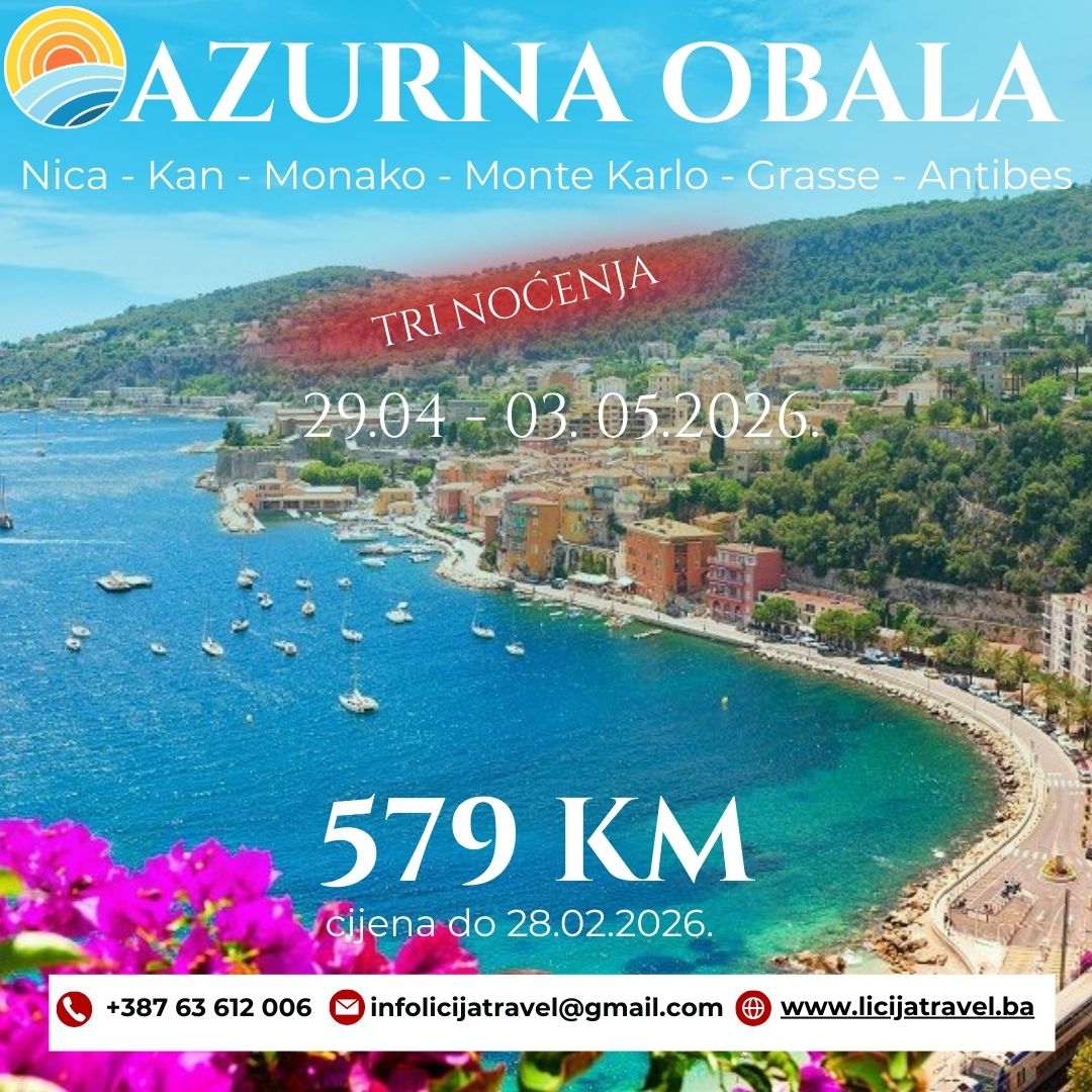 Nica, Kan, Monako, Monte Karlo, Grasse, Antibes PROGRAM PUTOVANJA Polazak: 29.04.2026. Povratak: 03.05.2026. PROGRAM PUTOVANJA 1.dan (Srijeda, 29.04.2026.) BIH-HR-SLOPolazak iz Konjica u 14:00 h, iz Sarajeva u 15:00 h, iz Banovića u 17:00 h a iz Tuzle u 18:00h. Putovanje prema graničnom prelazu sa Republikom Hrvatskom uz usputna zaustavljanja radi ulaska putnika. Noćna vožnja preko Hrvatske…