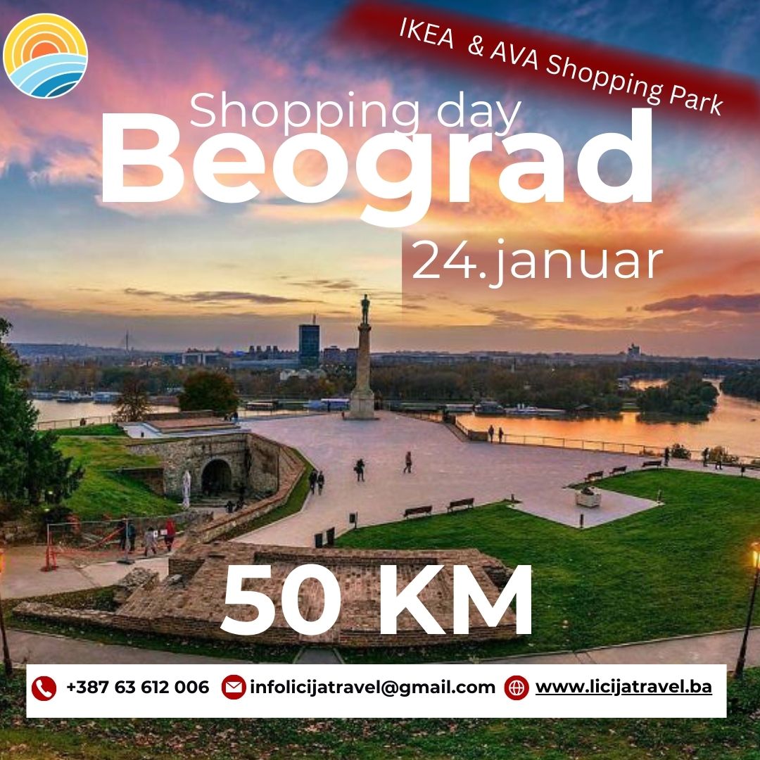 Jednodnevni izlet: 24.01.2026. (subota) Banovići u 04:30 (glavna AS), Živinice u 04:45h (Hrastik), Lukavac u 05:00 h (BP JK Magistala), Tuzla u 05: 15/ 05:20 h ( BCC i Brčanska Malta). Vožnja prema Beogradu sa pauzama po potrebi. Dolazak u Beograd (Ikea i Ava Shopping Park) u cca 10:00 h. Slobodno vrijeme od cca 2,5…