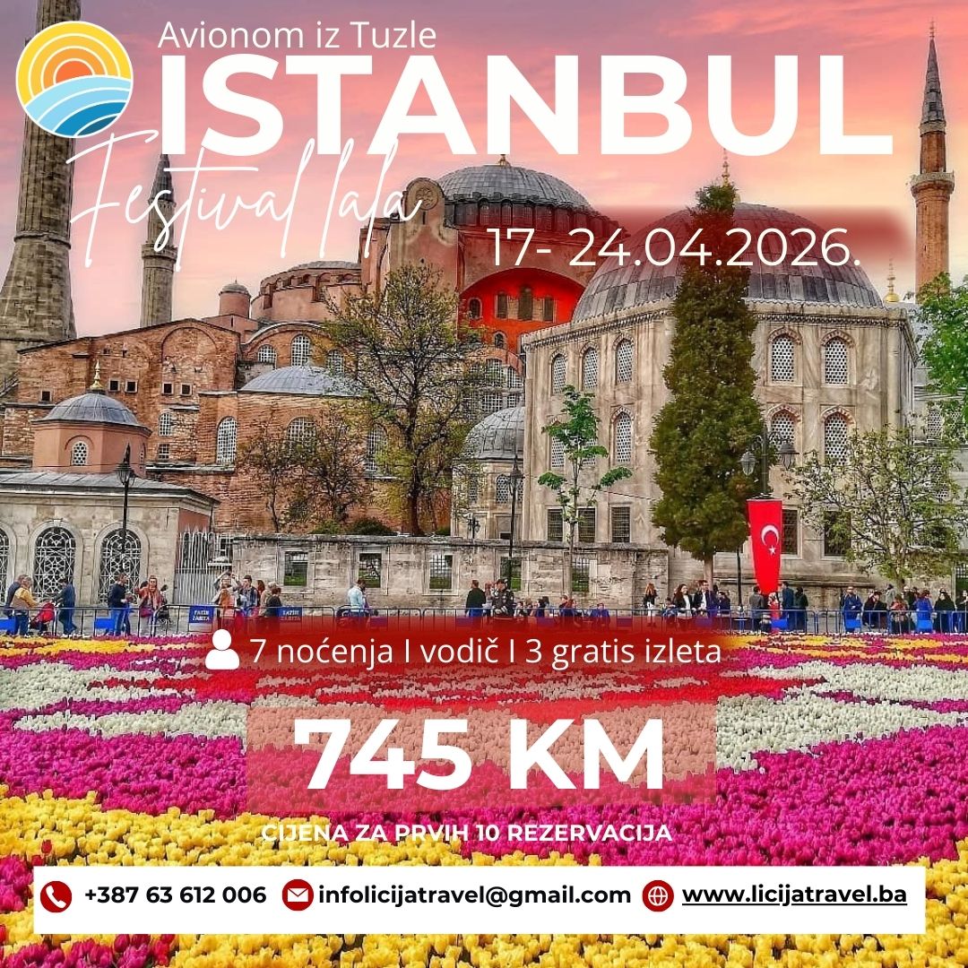 AVIO ARANŽMAN / 7 NOĆENJA / DORUČAK UKLJUČEN Polazak: 17.04.2026. Povratak: 24.04.2026. PROGRAM PUTOVANJA: Okupljanje putnika na međunarodnom aerodromu Tuzla 2 sata prije leta. Check in, pasoške i carinske formalnosti i prijava na let broj PC251. Polijetanje za Istanbul planirano je u 09:50 sati. Let u trajanju 1h50m.Planirano slijetanje u Istanbul u 12:40h po lokalnom…