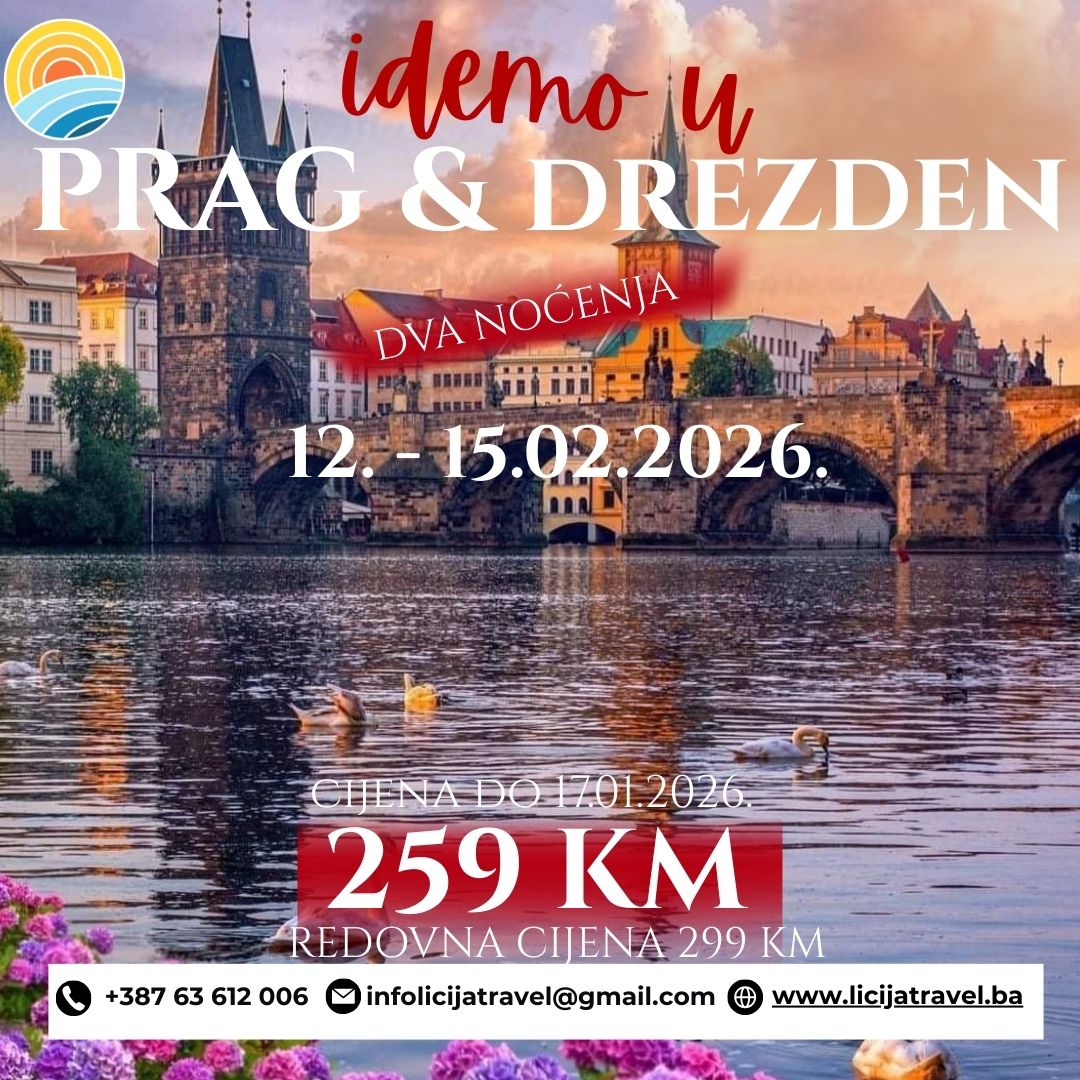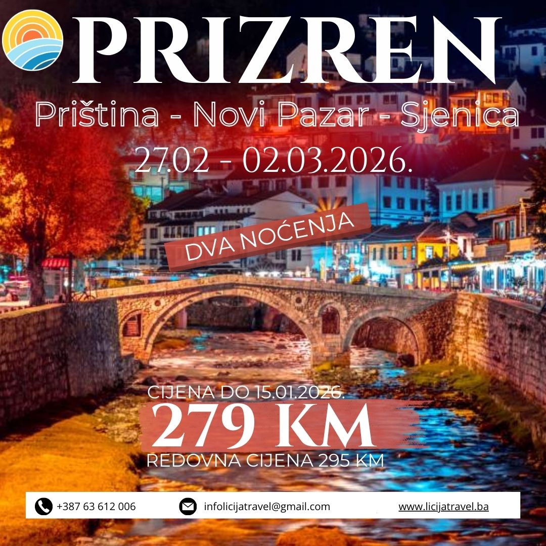 3 DANA / 2 NOĆENJA POLAZAK: 27.02.2026. POVRATAK: 02.03.2026. PROGRAM PUTOVANJA 1. i 2. DAN, 27. i 28.02. (PETAK / SUBOTA), TUZLA – NOVI PAZAR – PRIŠTINA – PRIZREN Polazak iz Tuzle u 19:00h, Živinice 19:15h, Banovići u 19:30h, Sarajevo u 22:00 h…Vožnja preko Rudog, Užica, Sjenice, Novog Pazara. Noćna vožnja. Dolazak u Prištinu u…