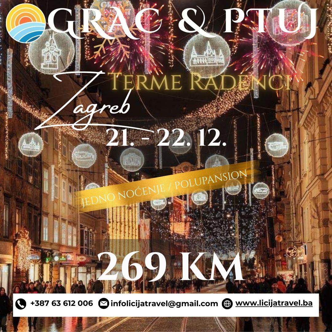 PROGRAM PUTOVANJA ADVENT GRAZ–PTUJ-ZAGREB UKLJUČEN POLUPANSION + KUPANJE NA TERMAMA RADENCI Hotel Radin 4* PROGRAM PUTOVANJA 1.dan (Subota) Tuzla – Graz – Terme Radenci Polazak grupe iz Tuzle ispred hotela Tuzla u 00.30 sati. Putovanje prema graničnom prelazu sa R. Hrvatskom uz povremena zaustavljanja radi ulaska putnika. Prelazak granice a zatim nastavak putovanja prema Graz-u.…
