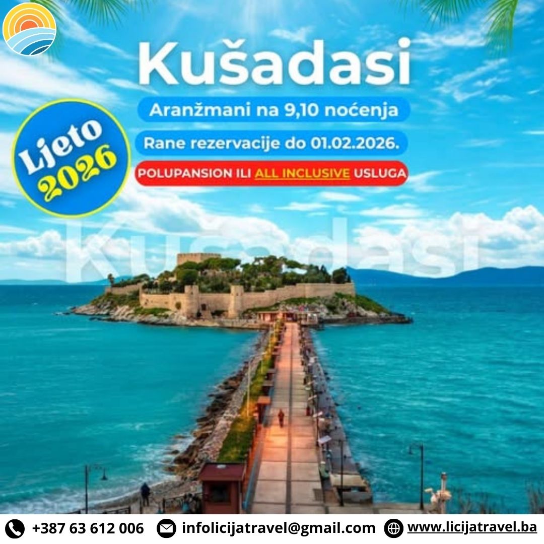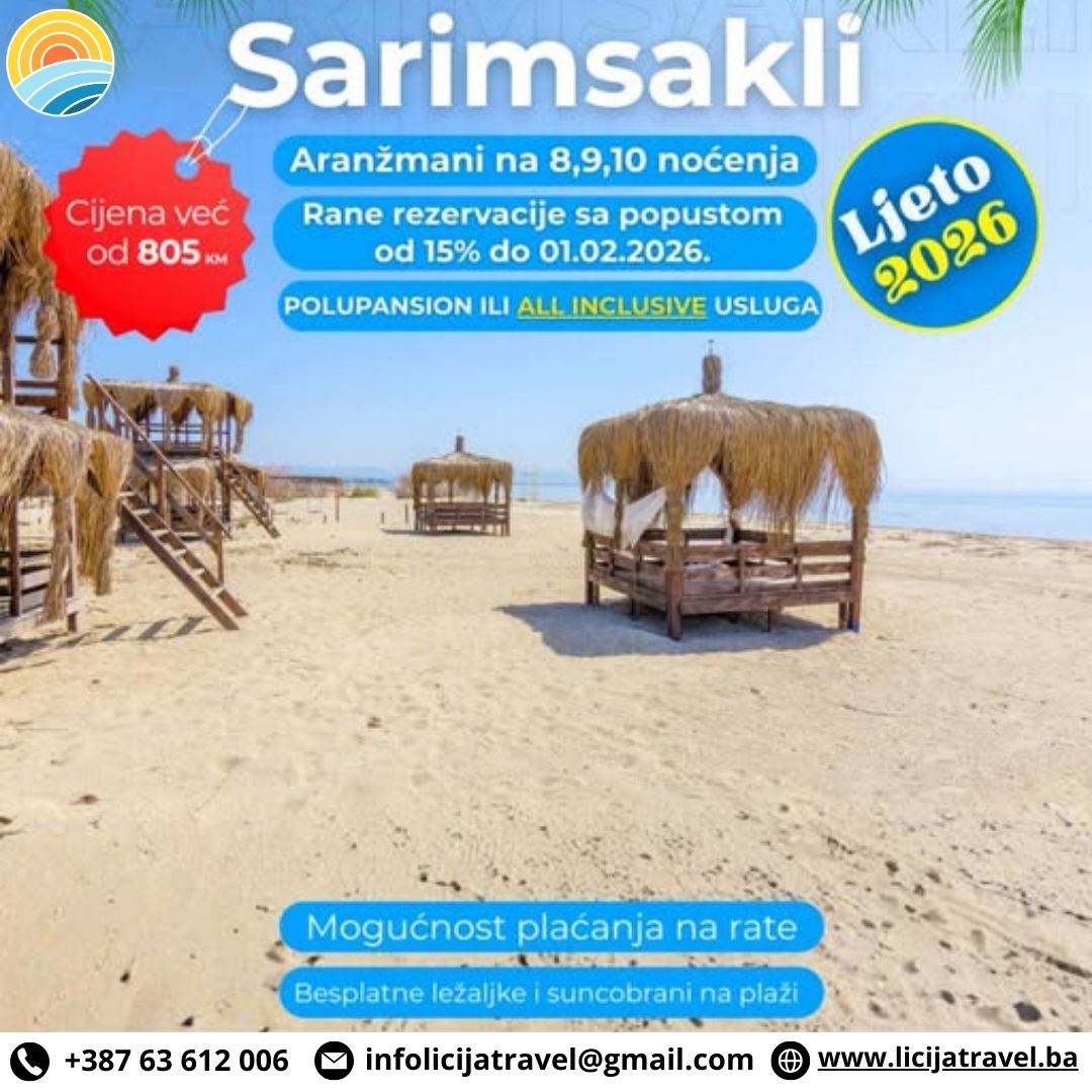 PROGRAM PUTOVANJA SARIMSAKLI / AYVALIK LJETO 2026. 10., 11., 12., DANA / BUS 8., 9.,10., NOĆENJA U SARIMSAKLI / AYVALIK CJENOVNIK BROJ 1 ZA RANE REZERVACIJE DO 30.12.2025. ODOBRAVAMO 15% POPUSTA NA CIJENE IZ TABELE TERMINI POLAZAKA ZA 8 NOĆENJA : 28.08. – 07.09.2026., TERMINI POLAZAKA ZA 9 NOĆENJA : 17.06. – 28.06.2026., 26.06. –…
