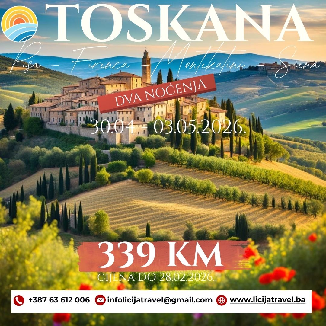 Firenca-Siena-Piza PROGRAM PUTOVANJA 4 DANA / 2 NOĆENJA Polazak: 30.04.2026. Povratak: 03.05.2026. Toskanu – mnogi smatraju najljepšom regijom Apeninskog poluostrva zbog njenih 120 zaštićenih zona bajkovite prirode, predivnih predjela i sela, a naročito zbog gradova izuzetne arhitekture, među kojima su najpoznatiji – Firenza, Piza, Sijena, ; San Điminjano, Piza i Luka – proglašeni dijelom svjetske…