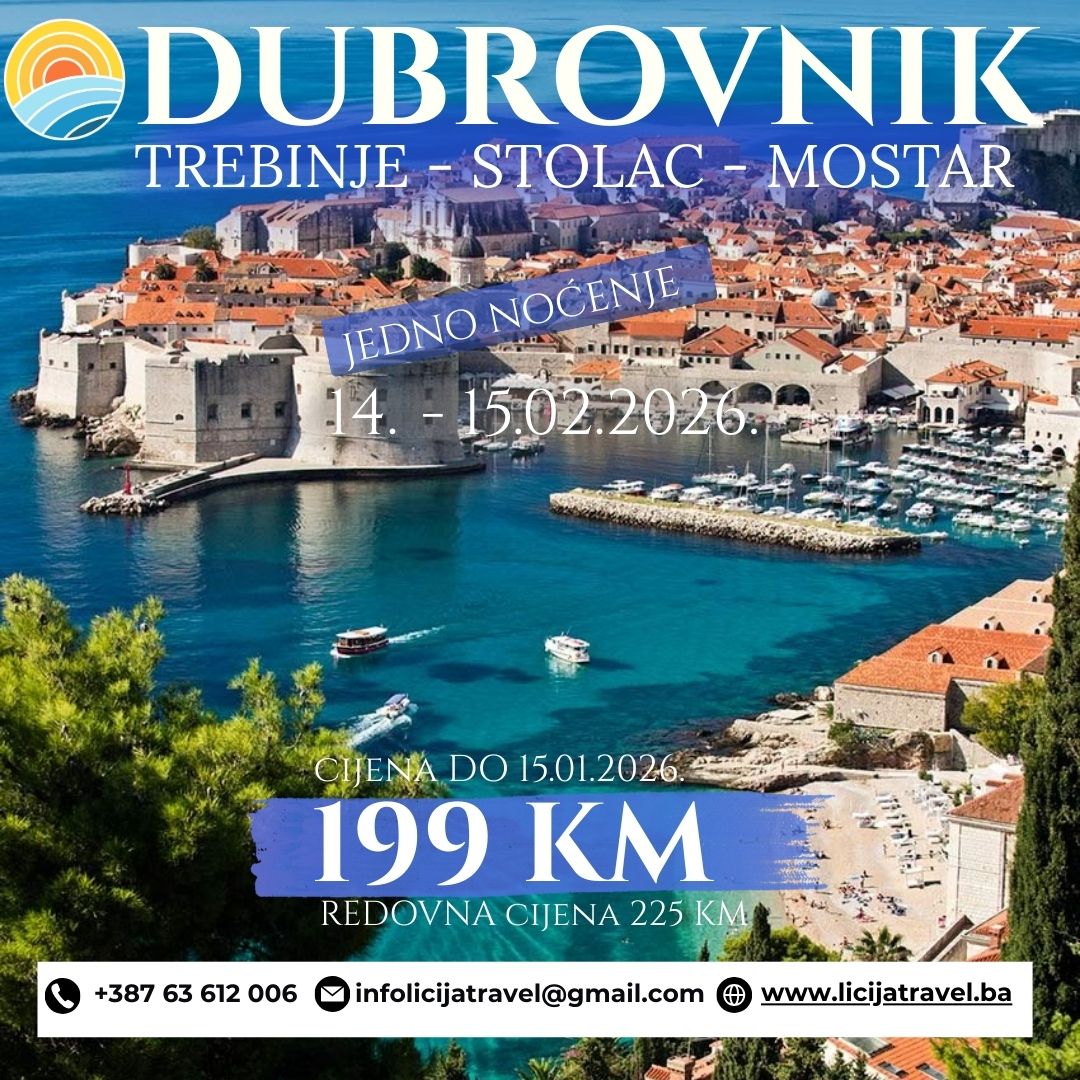 Sa obilascima Stoca i Mostara POLAZAK: 14.02.2026. POVRATAK: 15.02.2026. 2 dana / 1 noćenje POLASCI: Tuzla, Lukavac, Živinice, Banovići, Kladanj, Sarajevo, Konjic, Mostar.. PLAN PUTOVANJA: Subota, 14.02.2026. Tuzla-Živinice-Banovići-Sarajevo-Mostar -Trebinje- DubrovnikPolazak iz Tuzle 01:00h, Lukavac 01:15h (BP JK Magistarla), Živinice 01:30 h, Banovići 01:45h, Kladanj 02:30 (Hotel Bosna), Sarajevo 04:10 h (stupska petlja), Konjic 05:25 h..…