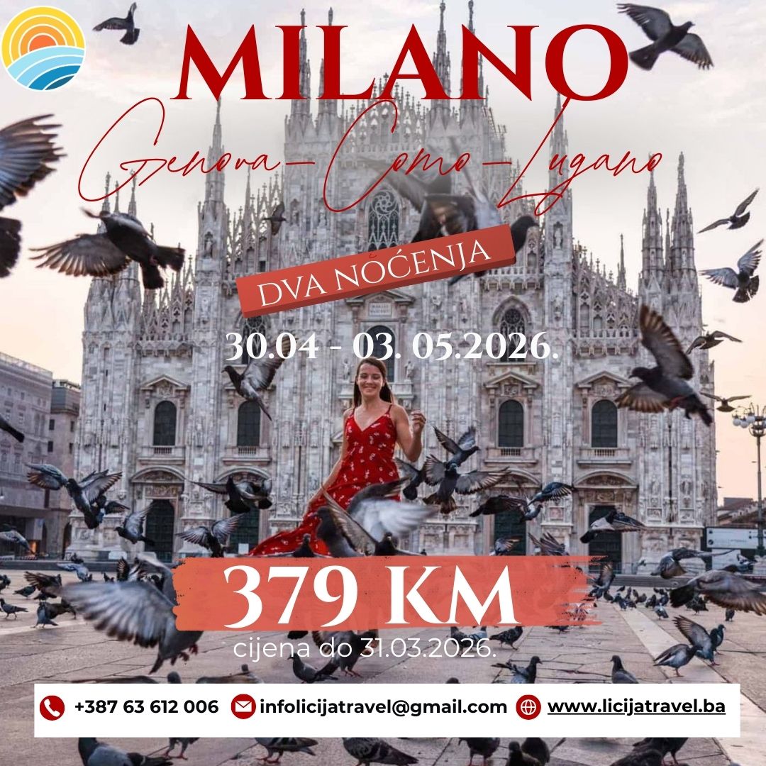 PROGRAM PUTOVANJA MILANO SA POSJETAMA LUGANU, JEZERU COMO I GENOVI POLAZAK: 30.04.2026. POVRATAK: 03.05.2026. PROGRAM PUTOVANJA 1.dan (Četvrtak, 30.04.2026.) BIH-HR-SLO Polazak iz Sarajeva ispred Zemaljskog muzeja u 17:00 sati a iz Tuzle ispred hotela „Tuzla“ u 20.00 sati. Polazak iz Banovića u 19:00 sati. Putovanje prema granicnom prelazu Orašje/Županja sa pauzama radi ulaska putnika. Prelazak granice.…