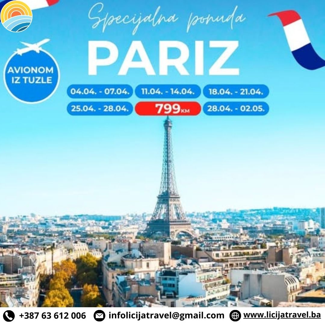 PROGRAM PUTOVANJA PARIZ AVIONOM IZ TUZLE 3 noćenja u hotelu sa 3* u Parizu na zoni metro linije polazak : 04.04.2026. povratak : 07.04.2026. polazak : 11.04.2026. povratak : 14.04.2026. polazak : 18.04.2026. povratak : 21.04.2026. polazak : 25.04.2026. povratak : 28.04.2026. PROGRAM PUTOVANJA Sastanak putnika na međunarodnom aerodromu Tuzla 2 sata prije leta. Check…