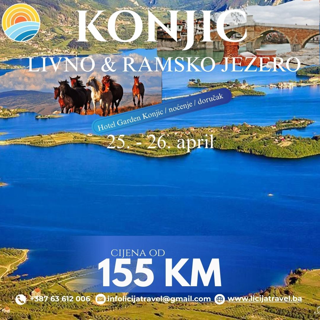 1 noćenje | Hotel Garden Konjic POLAZAK: 25.04.2025. POVRATAK: 26.04.2025. Polasci: Tuzla, Lukavac, Banovići, Živinice.. 1. DAN Tuzla – Livno – Ramsko jezero – Konjic Polazak iz Tuzle u 02:15h, iz Lukavca u 02:30h, iz Banovića u 03:00h.Usputna ukrcavanja prema dogovoru. Vožnja turističkim autobusom prema Livnu sa usputnim pauzama po potrebi grupe. Prije Livna pravimo…