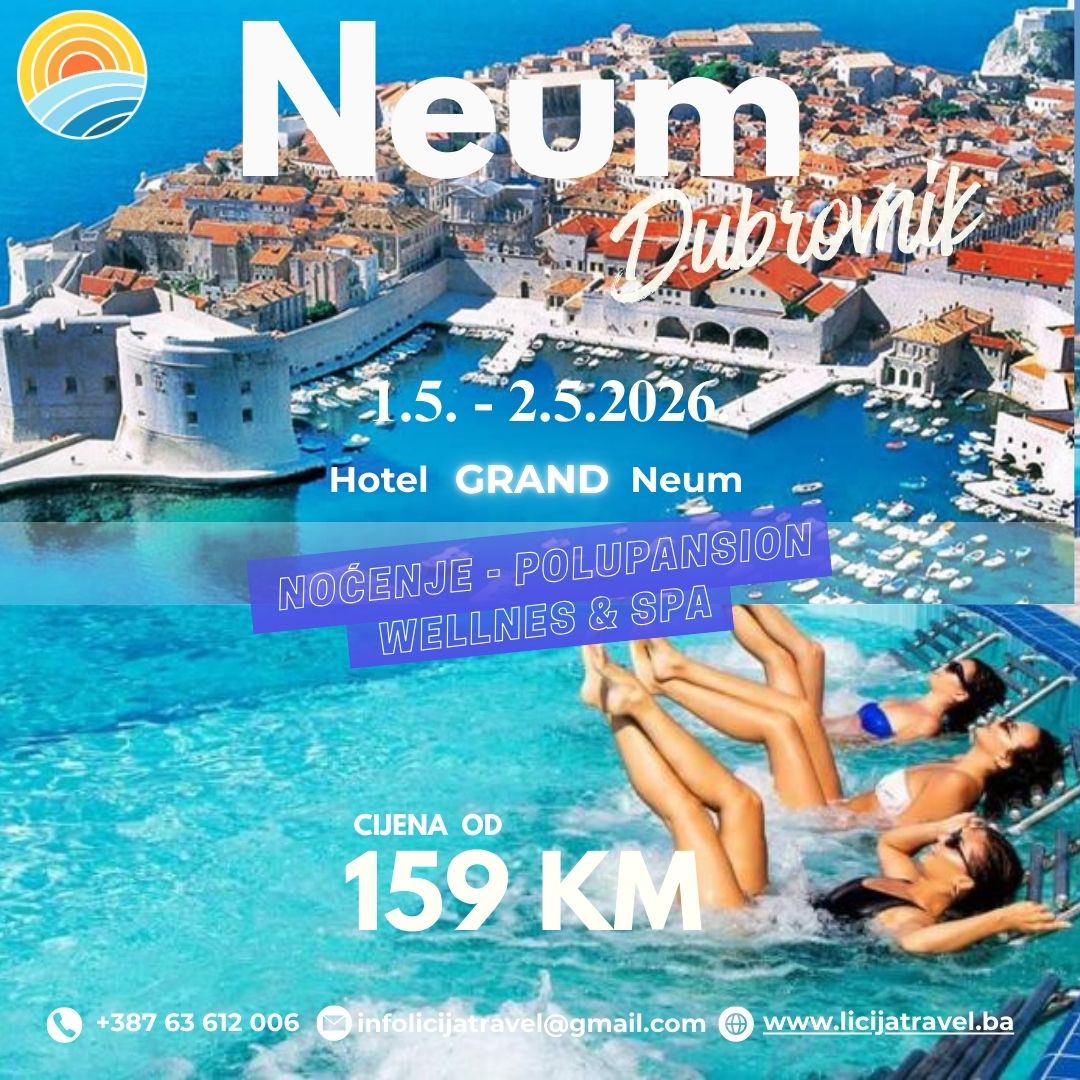 1 MAJ NA JADRANU | NEUM I DUBROVNIK01.05.-02.05.2026 | NOĆENJE polupansion / Grand Hotel Neum U cijenu uključeno: U cijenu nije uključeno: POLASCI (u noći četvrtak-petak)Brčko – 02:00 BP MešićOrmanica – 02:30h BP MešićSrebrenik – 02:45h Hotel ParkBanovići – 03:40h Glavna ASTuzla – 04:15h BCC stanicaLukavac – 04:30h BP Junuzović kopexGračanica – 04:20h TC FISDoboj…