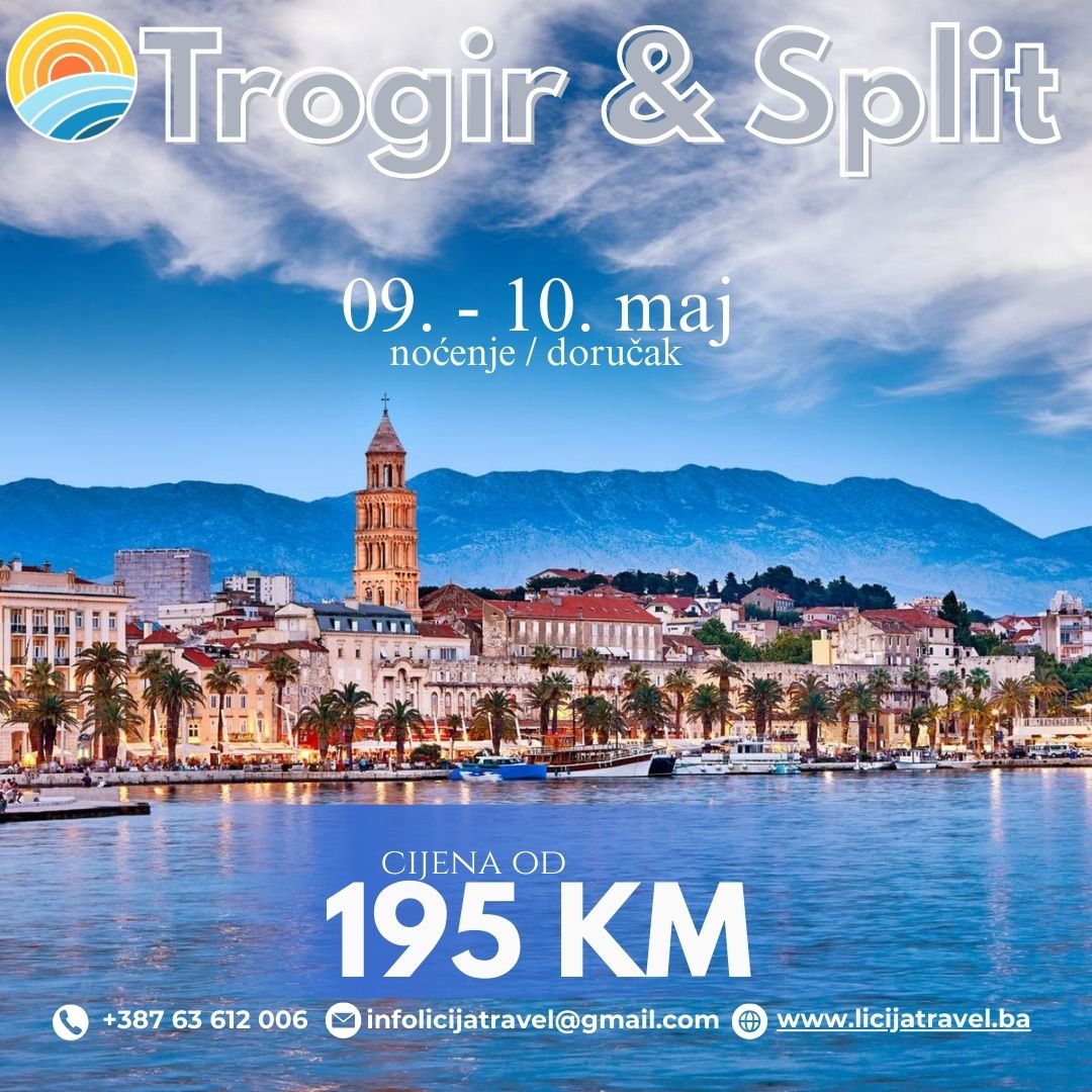 Polazak: 09.05. (petak na subotu) Povratak : 10.05.2026g. (nedjelja) PROGRAM PUTOVANJA: 1.Dan 09.05.2026 (subota) BiH- Trogir – SplitPolazak iz Tuzle u 01:00h, Banovići 01:45 h. Noćna vožnja turističkim autobusom prema Trogiru (Splitu) s usputnim pauzama po potrebi grupe. Dolazak u Trogir u prijepodnevnim satima. Fakultativni obilazak grada Trogira u pratnji lokalnog vodiča u trajanju od…