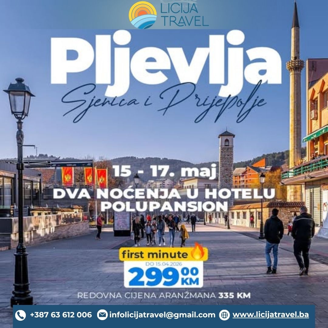 POLAZAK: 15.05.2026. POVRATAK: 17.05.2026. 3 dana / 2 noćenja PROGRAM PUTOVANJA: Atraktivno trodnevno putovanje vodi nas kroz predivne predjele Sandžaka i sjevera Crne Gore. U programu su spoj historije, kulture i prirodnih ljepota – od znamenitosti Pljevalja i Prijepolja, preko čuvenih vodopada Sopotnice, do spektakularnih meandara rijeke Uvac. POLASCI: Vožnja turističkim autobusom uz usputne pauze.…