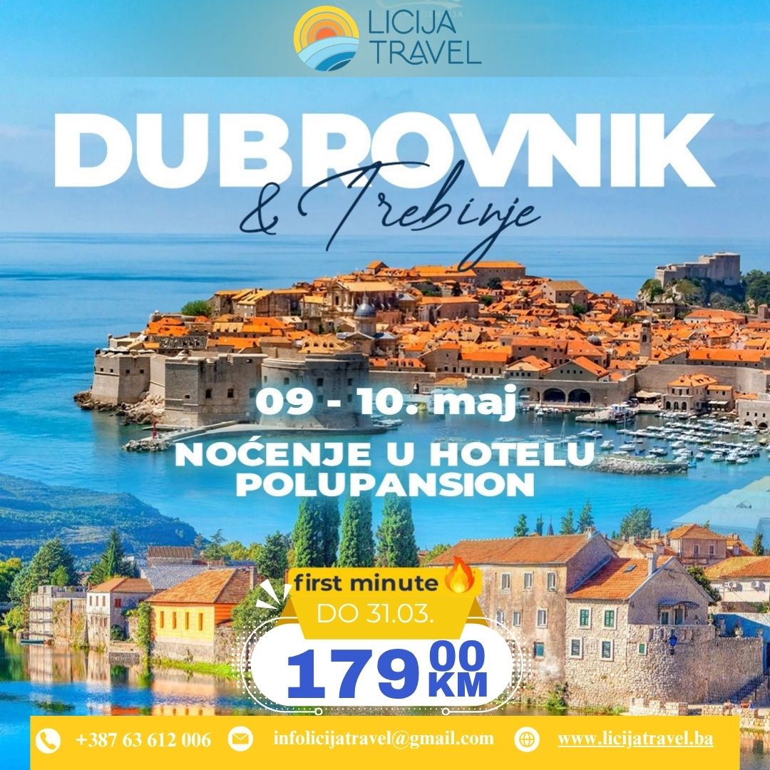 First minute: 179,00 do 31.03.2026. – redovna cijena 199,00KM U cijenu uključeno: – Prijevoz turističkim autobusom – Pratilac grupe tijekom putovanja – Organizacija putovanja U cijenu nije uključeno:– Putničko zdravstveno osiguranje 5,00KM (10,00KM za osobe dobi 60-70 god)– Individualni troškovi putnika– Lokalni vodiči 10 EUR (Dubrovnik i Trebinje) POLASCI: Brčko Mešić Bp kod kružnog toka, Ormanica Mešić Bp, Srebrenik kod…