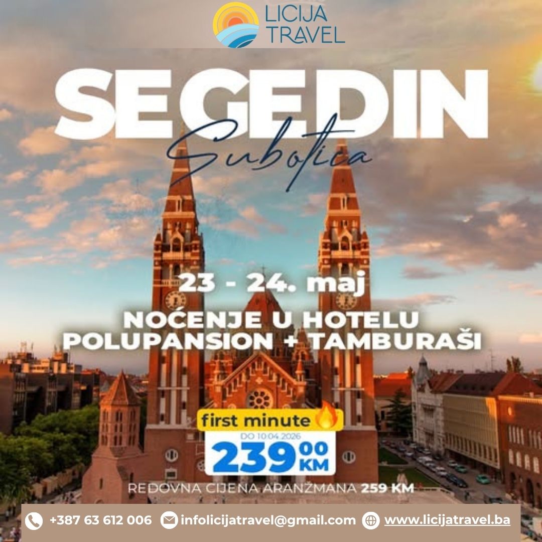 23.05. – 24.05.2026. 2 dana / 1 noćenje Dvodnevno putovanje vodi nas u dva šarmantna grada – Segedin u Mađarskoj i Suboticu u Srbiji. Gradovi poznati po bogatoj historiji, prelijepoj secesijskoj arhitekturi i opuštenoj vojvođanskoj atmosferi pružaju savršenu kombinaciju kulture, gastronomije i laganog putovanja. POLASCI: Noćna vožnja turističkim autobusom uz usputne pauze i granične formalnosti.…