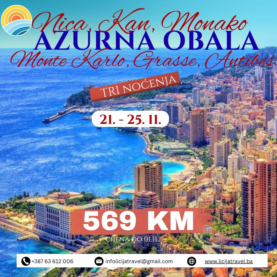 Nica, Kan, Monako, Monte Karlo, Grasse, Antibes PROGRAM PUTOVANJA Polazak: 21.11.2025. Povratak: 25.11.2025. PROGRAM PUTOVANJA 1.dan (Petak, 21.11.2025.) BIH-HR-SLOPolazak iz Sarajeva sa platoa željezničke stanice u 15.00 sati, iz Banovića u 17:00 h a iz Tuzle ispred hotela „Tuzla“ u 18.00 sati. Putovanje prema graničnom prelazu sa Republikom Hrvatskom uz usputna zaustavljanja radi ulaska putnika. Noćna…