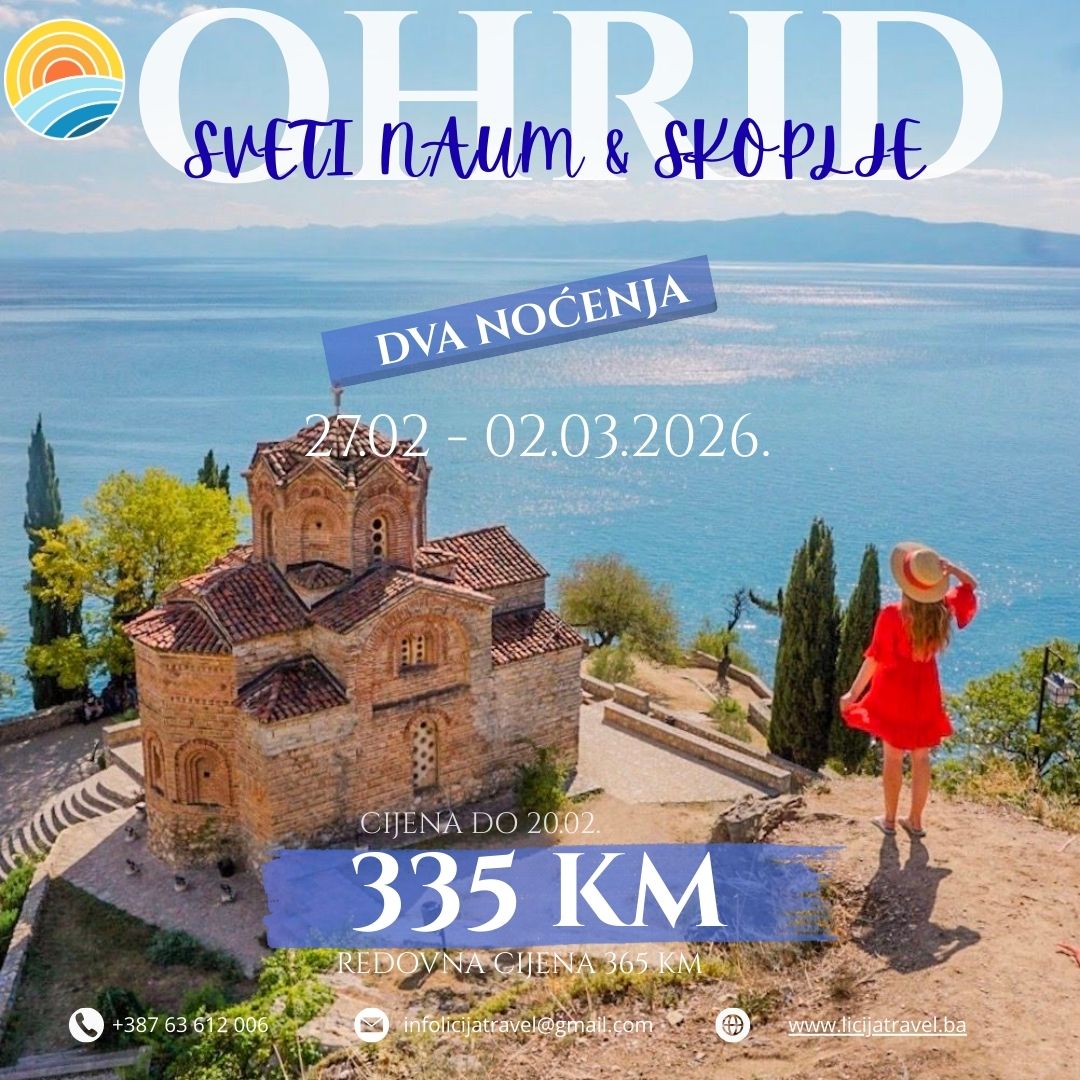 POLAZAK: 27.02.2026. POVRATAK: 02.03.2026. PROGRAM PUTOVANJA: 1.dan (Petak, 27.02.2026.) Banovići – Lukavac – Tuzla – Srebrenik – Brčko – Bijeljina – Beograd-Niš – Ohrid Polazak iz Banovića u 22:00 h, Živinice 22:15 h, Lukavac 22:35 h, iz Tuzle u 23:00h, Srebrenik 23:35h, Brčko 00:10h, Bijeljina 01:00h. Putovanje prema graničnom prelazu Sremska Rača uz zaustavljanja radi…