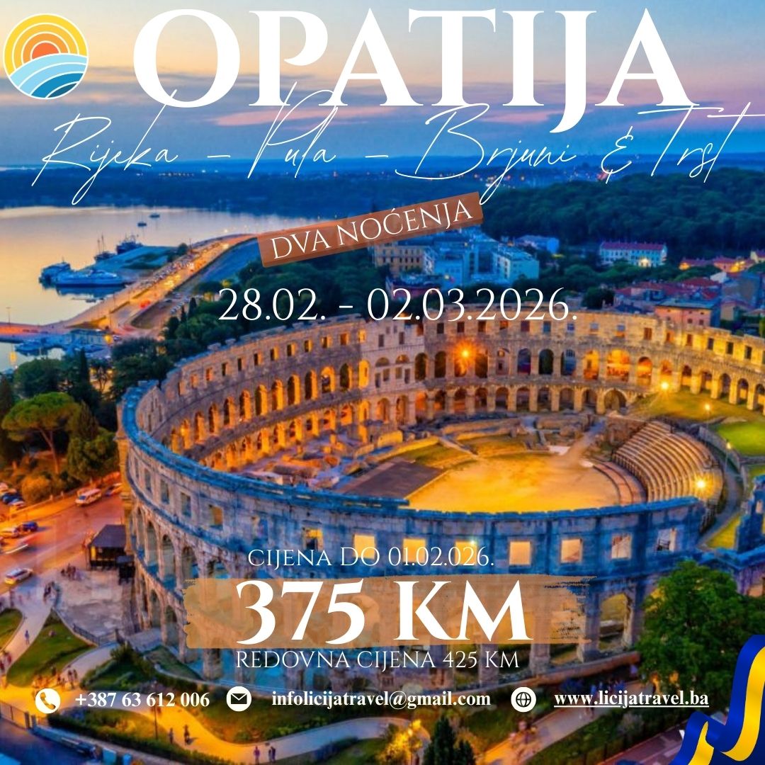 Dan nezavisnosti u Opatiji PROGRAM PUTOVANJA Rijeka-Opatija-Brijuni-Pula-Trst Polazak: 28.02.2026. Povratak: 02.03.2026. PROGRAM PUTOVANJA 1.dan (Subota, 28.02.2026.) Tuzla-Zagreb-Rijeka-Opatija Polazak iz Banovića u 01:00 sat, polazak ispred hotela Tuzla u 02:00 sati. Vožnja prema graničnom prelazu uz usputna zaustavljanja radi ulaska putnika. Putovanje prema Rijeci preko Zagreba. Dolazak u Rijeku u jutarnjim satima te odlazak u centar…