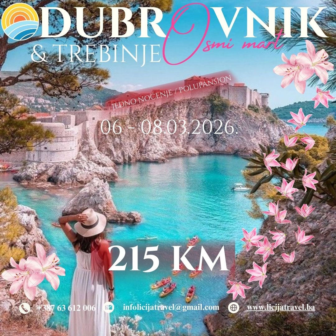 Sa obilascima Stoca i Mostara POLAZAK: 06.03.2026. POVRATAK: 08.03.2026. 2 dana / 1 noćenje POLASCI: Tuzla, Lukavac, Živinice, Banovići, Kladanj, Sarajevo, Konjic, Mostar.. *Ukoliko bude interesa od strane putnika sa područja Doboja, Maglaja, Zenice, Visokog…rutu kretanja preusmejravamo navedenim pravcem PLAN PUTOVANJA: Subota, 06.03.2026. Tuzla-Živinice-Banovići-Sarajevo-Mostar -Trebinje- DubrovnikPolazak iz Tuzle 23:45h, Lukavac 00:00h (BP JK Magistarla), Živinice…